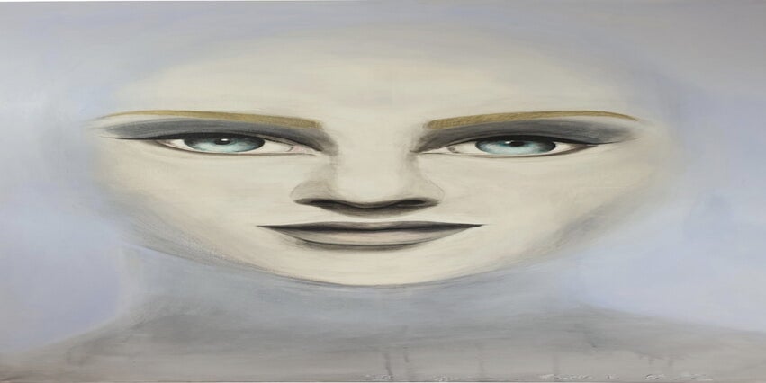 zeigt in zarten Fliedertönen einen weiblichen Kopf mit wasserhellen, strahlend blauen Augen. Die Farbgebung ist milchig hell und fast ätherisch, als würde der Kopf aus einem Nebel auftauchen. Das Ajna-Zentrum, auch bekannt als das Dritte Auge, symbolisiert Intuition und innere Weisheit. Die leuchtenden Augen im Bild verkörpern diese tiefere Einsicht und das spirituelle Erwachen, das mit dem Ajna-Zentrum verbunden ist.